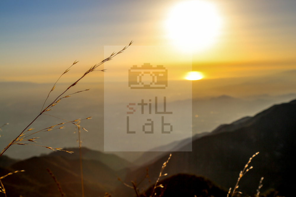 Blurry sunset view from top of the mountain near city