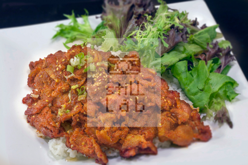 Sizzled Spicy Chicken Breast over Rice, Salad served with Miso Soup
